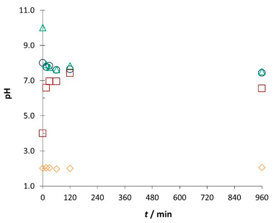 Throughout the whole adsorption time, pH values of dye solutions for pH0 = 2.00 were practically identical to the initial pH values (Figure 2). In contrast, for pH0 = 4.00, besides RB5 dye, the surface of activated carbon adsorbed more H+ ions than OH− ions [27], and therefore, the pH value after adsorption increased already after 15 min; then, it gradually formed a plateau and stabilised at pH ≈ 6.5. For an initial pH value of pH0 = 8.00, the pH value after adsorption slightly decreased and stabilised at pH ≈ 7.4.
