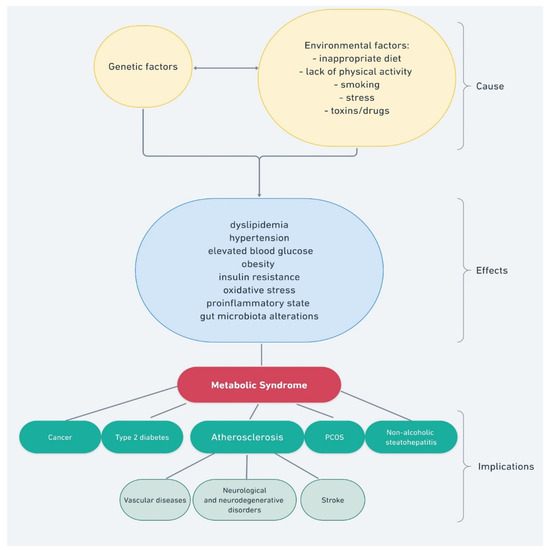 The metabolic syndrome, also called syndrome X, is a set of interrelated factors that significantly increase the risk of developing atherosclerosis and type 2 diabetes (T2DM) and, consequently, cardiovascular disorders [1]. The risk of developing the metabolic syndrome, and its course severity, can be reduced by eliminating risk factors, such as an inappropriate diet, physical inactivity, stress, anxiety-depressive disorders, personality disorders, and the resulting behavioral addictions (Figure 1).