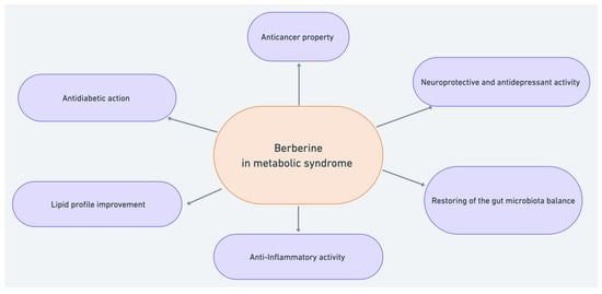 The authors searched the following databases: PubMed, Scopus, Springer, Taylor & Francis Online, and Google Scholar using the keywords: berberine and: metabolic syndrome, inflammation, cholesterol level disorders, obesity, diabetes mellitus, depression, mental disorders, cardiovascular diseases in recent 30 years. A review of more than 2000 studies on the metabolic syndrome and the biological activities of berberine, and its in vitro and in vivo properties, was carried out, and 173 manuscripts were selected regarding the description of the actions and the potential use of the alkaloid in patients at risk of a sequelae of syndrome X disorders.