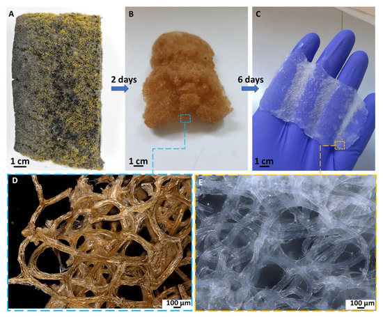 Schematic illustration of chitinous scaffold isolated from marine sponge A. fistularis. (A) Selected fragment of air-dried sponge. (B,D) The same fragment of the skeleton after 2 days of acid-base treatment. (C,E) Fully transparent and soft chitinous scaffold after isolation.