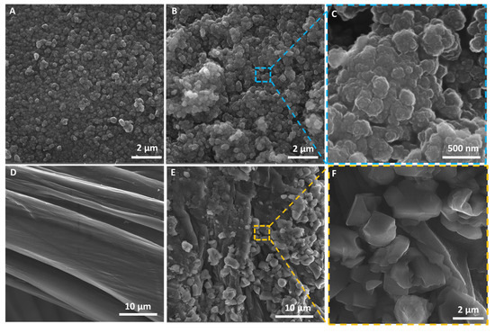 SEM photographs were made before and after immobilization of horseradish peroxidase for both the silica nanopowder and chitin-based scaffold (Figure 2). Based on the images presented, it can be seen that silica nanopowder before enzyme immobilization (Figure 2A) is characterized by homogeneous particles with smooth texture, whereas after enzyme immobilization (Figure 2B,C), aggregates with a rough surface can be observed. These changes are probably caused by the efficient deposition of the HRP enzyme and its further cross-linking using glutaraldehyde. Similar observations were previously described by Voss et al. [45], where horseradish peroxidase was immobilized onto porous silica nanopowder. In the case of the chitinous scaffold from A. fistularis, the fibers’ surface before immobilization was uniform and smooth, which confirms a well-performed isolation process (Figure 2D) [30,46,47]. By contrast, after HRP immobilization, aggregates at a size around 2–4 µm in diameter can be observed, which confirms the effective attachment of enzyme molecules onto the chitinous scaffold. As shown in Figure 2E,F, the enzymes’ aggregates fully cover the support material, which can suggest high enzyme affinity of the chitin scaffold and deposition of HRP on it. Similar observations have been described in the work of Arslan [48], who immobilized horseradish peroxidase on amine-functionalized glycidyl methacrylate-g-poly(ethylene terephthalate) fibers and used the produced biocatalytic system for removal of azo dyes from aqueous solutions. The obtained results confirm that chitinous fibers constitute a suitable matrix for enzyme immobilization. Further, it should be highly emphasized that in the presented work, the HRP enzyme was immobilized onto a chitinous scaffold isolated from A. fistularis marine sponge for the first time, indicating the high novelty of the presented study.