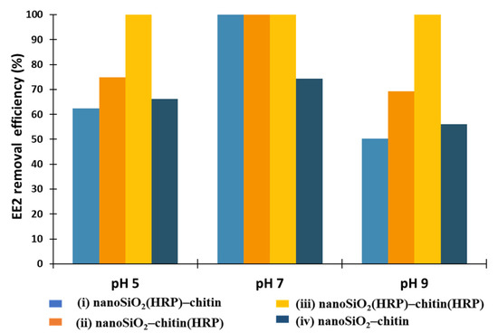 Oxidoreductases, such as horseradish peroxidase, were established as suitable biocatalysts for the removal of estrogens from the wastewaters [2,12]. Previous investigations regarding usability of immobilized form of HRP indicated that pH has a great importance in terms of activity of immobilized biomolecules and the removal process of estrogens [2,12,41]. The study presented by El-Nahass et al. [52] showed that pH strictly affects the activity of free and immobilized HRP due to the transport of protons in the biomolecule active site, at specific pH. The authors determined that free and immobilized enzymes onto mesoporous silicates possessed the highest activity at pH 6. However, the study presented by Xu et al. [2] showed that HRP immobilized onto Fe3O4 nanoparticles obtained the highest relative activity, at pH 7. Thus, the optimal pH for HRP activity can vary depending on the applied support material. Moreover, the removal efficiency of specific compounds, such as estrogens, could also be different, depending on the reaction environment. Thus, in the first step of this investigation, the effect of pH on the removal of EE2 were examined in pH 5, 7 and 9. As can be observed in Figure 4, the removal efficiency of EE2, ranging from 62% for the biocatalytic system (i) nanoSiO2(HRP)–pure chitin to 100% for system (iii), where immobilized HRP was used at both stages of EE2 removal. The highest removal efficiencies, equaling 100%, were obtained after a process carried out at pH 7 using EE2 removal systems (I, ii, and iii). In the case of (iv) system, after its application, the removal efficiency of estrogen was 74%. These results indicate that simple adsorption by nanoSiO2 and chitin is not sufficient enough, and catalytic action of immobilized HRP is required to attain a high removal rate. The results obtained for pH 9 in the case of the application of produced EE2 removal systems showed the lowest removal efficiencies of EE2, compared to the processes carried out at pH 5 and 7, and equaled less than 70%. However, for the biocatalytic system made of nanoSiO2(HRP)–chitin(HRP), the removal efficiency of estrogen was 100%. This is probably due to the fact that, in this system, more HRP biomolecules were immobilized, and the bioconversion process could be carried out more effectively, at both degradation stages. It should also be remembered that, due to the immobilization process, enzymes could be more stable under various process conditions, retaining high activity, compared to the free form of biomolecules, even at high pH conditions [42]. Despite the high bioconversion rate, it should be underlined that synergic removal of estrogen was observed by adsorption and catalytic conversion of EE2, which allowed us to obtain 100% removal efficiency, albeit with a pronounced dominance of catalytic conversion.