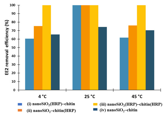 In the next step, it was decided to investigate the effect of temperature on removal efficiency of EE2 using the proposed systems (Figure 5). The temperature is one of the most important parameters affecting adsorption and enzymatic conversion. As observed, at higher temperatures, biomolecules are prone to inactivation due to enzymes sensitivity and denaturation [54]. Further, it is important to lower the transformation costs in order to conduct industrial processes in ambient conditions (e.g., wastewater treatment plants). It should also be stated that both chitin and nanosilica are stable over a wide range of temperatures; therefore, they could be used as stable supports for enzyme immobilization [46,55]. In this study, EE2 removal processes were carried out at temperatures of 4, 25 and 45 °C. Previously, Xu and others [2] investigated estrone (E1) removal by horseradish peroxidase immobilized on a nanofibrous support made of poly(acrylic acid)/poly(vinyl alcohol) (PAA/PVA) with Fe3O4 nanoparticles. As observed, the highest removal efficiency of estrogen was noted at 32.4 °C, 39.4 °C, and 49.9 °C for free HRP, HRP immobilized onto PAA/PVA nanofibers, and HRP immobilized onto nanofibers with Fe3O4, respectively. Furthermore, it was observed that the removal of estrogen by immobilized biomolecules was significantly higher than after the process using free HRP at the entire investigated temperature range, which could be explained by the fact that support materials protect HRP against high-temperature-induced deactivation [56]. Surprisingly, in our research, the most suitable temperature for the most effective EE2 removal has been determined as 25 °C. In these conditions, the following three biocatalytic systems allowed us to remove 100% of EE2 from aqueous solutions: (i) nanoSiO2(HRP)–pure chitin, (ii) pure nanoSiO2–chitin(HRP), (iii) nanoSiO2(HRP)–chitin(HRP). For system (iv), without immobilized enzymes, adsorption of estrogen onto a nanoSiO2 and chitinous scaffold allowed us to obtain 74% removal efficiency. At the lowest temperature, which was 4 °C, EE2 removal efficiency ranged from 60% for removal system (i) to 100% for removal system (iii). In the case of 45 °C, the results of removal efficiencies were similar to the results obtained after process at 4 °C, which shows that the proposed removal system, irrespective of temperature value, can remove over 60% of EE2. Moreover, it was observed that after the use of biocatalytic system (iii), where HRP was immobilized onto both carriers, the removal efficiency equaled 100% for each of the investigated temperatures, suggesting a high stability of the immobilized enzyme in this temperature.