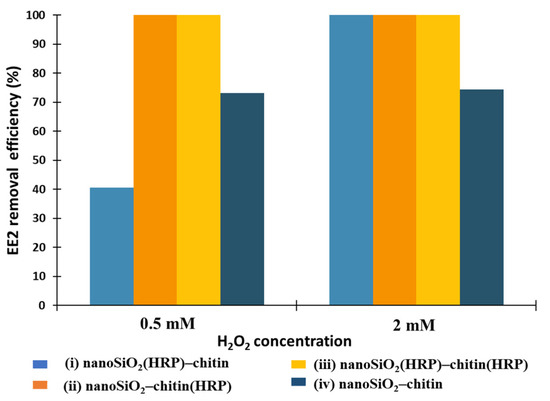Hydrogen peroxide is usually applied as co-substrate of horseradish peroxidase. It plays the role of one-electron donor between the HRP active site and converted substrate [57]. However, too high a concentration of H2O2 in the reaction environment can negatively affect the activity of horseradish peroxidase. Wang et al. [45] used HRP immobilized onto polyacrylonitrile beads and the next such biocatalytic system was used for removal of 2,4-dichlorophenol from wastewater. The authors showed that hydrogen peroxide solution at concentration above 1 mM can inhibit the catalytic activity of biomolecules due to blocking of the enzyme’s active site. The study of Ai and co-authors [12] proved that overdose of hydrogen peroxide in conversion reactions catalyzed by HRP can act as scavengers of active radicals due to reduction reactions. The authors used s biocatalytic system composed of NH2-Fe3O4@SiO2 with HRP immobilized for degradation of estradiol (E2) from an aqueous solution. As determined, the optimal concentration of H2O2 for process catalyzed by immobilized HRP was 24 mg/L. By contrast, in another work, the optimal hydrogen peroxide concentration for estrone (E1) removal by free HRP and HRP immobilized onto PAA/PVA nanofibers was determined at 0.05 mM. Higher H2O2 concentrations negatively affected the enzymatic activity of HRP and, in consequence, a lower removal efficiency of E1 was noted. However, when support was additionally doped by Fe3O4 nanoparticles, the removal efficiency of E1 reached a maximum with the presence of H2O2 at a concentration of 0.1 mM, which could be explained by excessive H2O2 consumption by magnetite in the Fe2+ oxidization process. Therefore, a suitable initial concentration of hydrogen peroxide is crucial for estrogen removal by HRP-based catalytic reactions and should be determined for all support-enzyme systems. Herein, the removal of 17α-ethinylestradiol was conducted using two H2O2 concentrations, which were 0.5 and 2 mM. As shown in Figure 6, a higher concentration of H2O2 (2 mM) allowed us to fully remove EE2 from aqueous solutions using all systems containing immobilized HRP (i, ii and iii). It stays in agreement with results described by Patel et al. [58], where in situ encapsulation of horseradish peroxidase in electrospun porous silica fibers was carried out. The authors showed that enzyme encapsulated in produced fibers possessed the highest specific activity with the presence of hydrogen peroxide solution at a concentration equaling 2 mM. Moreover, a further increase in H2O2 concentration caused the inhibition of biomolecules and a decrease in its catalytic activity. In our work, it was shown that a lower concentration (0.5 mM) of hydrogen peroxide in the reaction environment caused a significant decrease in removal efficiency of EE2 to 40% using system (i), where HRP was immobilized onto nanosilica, which could be explained by limited transport of H2O2 to the active site of biomolecules immobilized onto nanoSiO2, cross-linked by glutaraldehyde. However, systems (ii) and (iii) allowed us to remove 100% of EE2 from aqueous solutions with the presence of hydrogen peroxide at lower concentrations. In the case of removal system (iv), where pure nanoSiO2 and pure chitin were used in the EE2 removal process, only adsorption as a removal mechanism was possible. The removal efficiency of EE2 was determined and equaled 73% (H2O2 concentration 0.5 mM) and 74% (H2O2 concentration 2 mM). The lack of biomolecules immobilized onto supports meant that the H2O2 concentration did not affect the removal efficiency of estrogen.