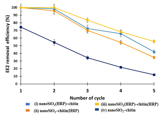 Reusability of the proposed systems in terms of removal of estrogen from aqueous solution is one of the most important parameters affecting their practical application. In our study, it was decided to investigate reusability of the proposed systems in five consecutive catalytic cycles (Figure 8). It could be seen that the removal efficiencies of estrogen after application of each of the systems tested decreased. For example, the removal efficiency of EE2 decreased from 73% (1st catalytic cycle) to almost 12% (5th catalytic cycle) after using pure nanoSiO2 –pure chitin system. The probable explanation of this could be pores clogging and, in consequence, lower adsorption of EE2 onto the nanoSiO2 and chitinous scaffold over repeated use [60]. It was also shown that after five catalytic cycles, EE2 was removed by other systems with the following efficiencies: 42%, 35% and 56%, for (i) nanoSiO2(HRP)–pure chitin, (ii) pure nanoSiO2–chitin(HRP) and (iii) nanoSiO2(HRP)–chitin(HRP), respectively. The higher values of EE2 removal efficiencies were observed for system (i), compared to system (ii) in all performed cycles, which can be explained by a higher content of HRP immobilized onto nanosilica than chitin, and a more efficient enzymatic conversion. System (iii), where HRP was immobilized onto both supports, allowed us to achieve 100% removal efficiency of EE2 in the first two cycles, and then constantly decreases until 56% is reached after five cycles. The fact could be affected by HRP enzyme consumption, its inactivation over repeated use, by blocking of active sites by conversion products and partial elution of biomolecules from the support [11]. Nevertheless, the removal of over 50% of EE2 after five degradation steps shows formation of stable enzyme–support interactions, i.e., an improvement of enzyme stability over repeated use.
