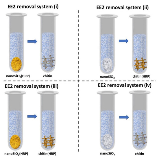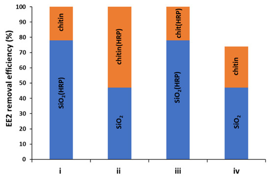After confirmation of effective enzyme immobilization and determination of the most suitable conditions for EE2 removal, it was also important to determine the mechanism of estrogen removal. In the study, the following four combinations of prepared systems have been developed: (i) nanoSiO2(HRP)–pure chitin, (ii) pure nanoSiO2–chitin(HRP), (iii) nanoSiO2(HRP)–chitin(HRP), (iv) pure nanoSiO2–pure chitin (Figure 9). Due to the fact that, in the removal process, materials with and without immobilized HRP were used, it is expected that the mechanism of EE2 removal varies for each of the systems, and the percentage contribution of adsorption and enzymatic conversion will be different. Experiments with pristine nanosilica and chitin showed that these materials are capable of adsorption of 48% and 27% of 17α-ethinylestradiol, respectively. Although both materials used in the study are known for their good sorption properties, the chemical structure and chemical moieties of the 17α-ethinylestradiol limit its effective adsorption [61] and makes single adsorption unsuitable for removal of this micropollutant. This is proved by the result of an adsorption experiment using pristine materials, which showed that after two stages of EE2 sorption, less than 75% of the pollutants were removed from the solution. As expected, the adsorption capacity of materials with immobilized HRP subjected to thermal inactivation were lower, as compared to pristine materials. Due to the deposition of the enzyme molecules and saturation of the surface-active centers, the adsorption rate of EE2 onto nanosilica and chitin attained 40% and 22%, respectively. By contrast, nanosilica and chitin with active immobilized HRP showed significantly higher removal of EE2, which reached 78% and 63%, respectively. This data clearly shows that in the systems with immobilized HRP, the removal of EE2 occurred due to simultaneous adsorption and biocatalytic conversion. Nevertheless, the application of a single system with immobilized enzymes makes it impossible to completely remove EE2, and use of a supporting stage is required to achieve a higher removal rate. From the presented results, it is also clear that the percentage contribution of catalytic conversion in degradation of EE2 plays an important role and increases its removal rate by about 40% for both analyzed systems. However, in general consideration of the removal mechanism, it could be summarized that, in all tested systems, adsorption is a dominant mechanism, whereas catalytic conversion supports this process. Finally, based on the obtained data, it should be highlighted that nanosilica seems to be a more promising material for adsorption/catalytic conversion of 17α-ethinylestradiol, because systems made of silica and/or silica with immobilized HRP made it possible to completely remove EE2 from the solution, whereas use of chitin-based systems allowed for around a 90% removal rate of EE2.