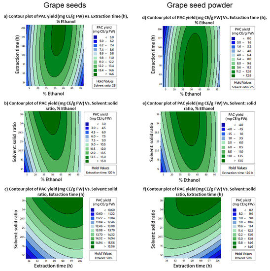 Contour plots of PAC yield variation (mg CE/g FW) under different extraction conditions and combinations of optimized parameters; % ethanol, solvent: solid ratio (v:w), and extraction time (h). Contour plots (a,d) describe the variation of PAC yields from grape seeds and grape seed powder, respectively, when % ethanol and extraction time are changed while holding the solvent: solid ratio at 25 (v:w). Contour plots (b,e) describe the variation of PAC yields under different combinations of % ethanol and solvent: solid ratio for grape seeds and grape seed powder, respectively, while holding extraction time at 120 h. Similarly, contour plots (c,f) describe the variation of PAC yields under different extraction times and solvent: solid ratios for grape seeds and grape seed powder, respectively, when % ethanol is held at 50%. mg CE/g FW, mg catechin equivalence/g fresh weight; PAC, proanthocyanidins; v:w, volume: weight.