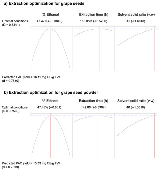 The extraction conditions were optimized by creating optimization plots with a focus to maximize the PAC yield (Figure 2). Optimization of the extraction process for GS predicted a maximum PAC yield of 16.1 mg CE/g FW (Figure 2a). Optimum extraction conditions were 47% of ethanol, 150 h of extraction time, and an s:s ratio of 40 (v:w). Optimum extraction conditions for GSP were closely similar to the GS. A maximum PAC yield of 15.3 mg CE/g FW was predicted for GSP when the extraction conditions were tuned to 47% of ethanol, 142.6 h of extraction time, and an s:s ratio of 40:1 (v:w) (Figure 2b). The contour plots and the optimization plots suggest an s:s ratio over 40:1 (v:w) to achieve the maximum yield of PAC. Thus, further incrementation of the s:s ratio may increase the extractable PAC yield, and the real optimum s:s ratio may be higher than 40:1 (v:w).