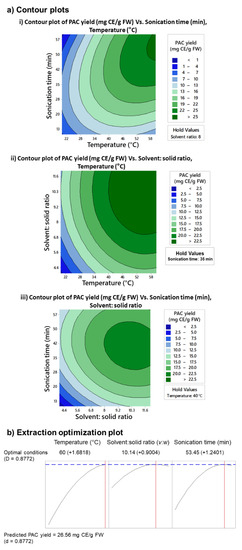 Optimization plots were created to identify the optimum extraction conditions to obtain the highest yield of PAC (Figure 3b). Optimum conditions to extract PAC from GS were a temperature of 60 °C, a s:s ratio of 10.14 (v:w), and an ultrasonication time of 53 min. The predictable PAC yield was 26.6 mg CE/g FW. The optimum temperature of 60 °C is the highest temperature tested in this extraction process. Considering the optimization plots and contour plots, more PAC could be extracted at temperatures higher than 60 °C. However, temperatures over 60 °C were not tested, considering the negative effect of high temperatures on the stability of PAC.