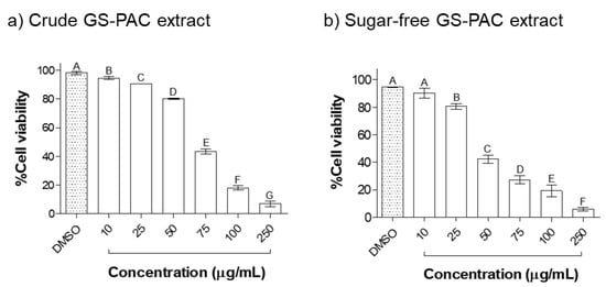 Initially, non-toxic concentrations of crude and sugar-free GS-PAC extracts were determined by the MTS cell viability assay (Figure 5). The crude GS-PAC extract showed a considerable reduction in cell viability (<75%) at concentrations over 50 µg/mL. The sugar-free GS-PAC extract depicted higher toxicity in AML12 cells compared to the crude extract. Concentrations over 25 µg/mL of sugar-free GS-PAC extract reduced the % cell viability below 50%. Based on these results, 10, 25, and 50 µg/mL concentrations of crude and sugar-free GS-PAC extracts were selected to determine biological activity.