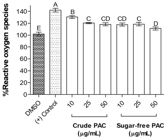 Potential of crude and sugar-free grape seed PAC extracts to ameliorate palmitic-acid-induced ROS in AML12 mouse liver cells. AML12 cells were pretreated with 10, 25, and 50 µg/mL concentrations of crude and sugar-free GS-PAC extracts for 24 h and exposed to palmitic acid (200 µM) for 24 h to induce ROS production. Cellular ROS production was measured by DCFDA cellular ROS detection assay and expressed as % ROS compared to negative control. Results were given as the mean ± SD of three independent experiments, and means that do not share a similar letter are significantly different (p ≤ 0.01). DMSO, dimethyl sulfoxide; PAC, proanthocyanidins.