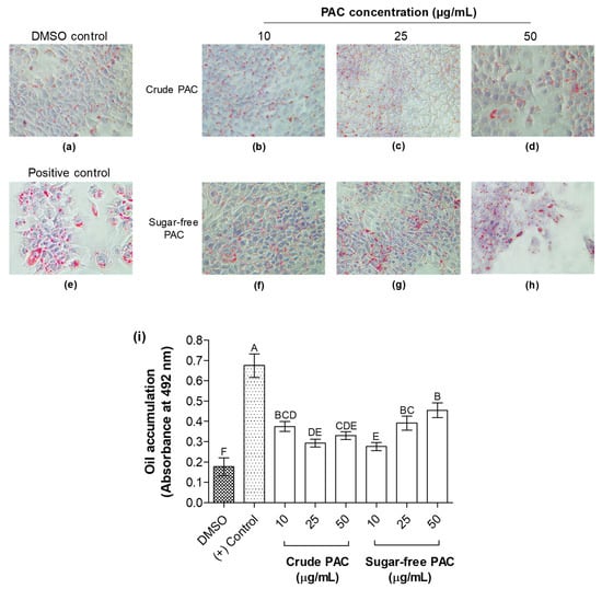 The potential of crude and sugar-free grape seed PAC extracts to reduce palmitic-acid-induced steatosis in AML 12 cells. AML12 cells were pretreated with 10, 25, and 50 µg/mL concentrations of crude grape seed PAC (b–d) and sugar-free grape seed PAC (f–h) extracts for 24 h and exposed to palmitic acid (200 µM) for 24 h to induce cellular lipid accumulation. Cells were stained with Oil Red O stain and visualized under a microscope (×100) to compare cellular lipid accumulation with vehicle (DMSO) control (a) and positive control (e). After microscopic visualization, Oil Red O stain retained in cells was extracted using 100% isopropanol. Oil Red O stain concentrations in isopropanol extracts were compared by measuring the absorbance at 492 nm as an indirect measurement of cellular lipid accumulation (i). Results were given as mean ± SD of three independent experiments, and means that do not share a similar letter are significantly different (p ≤ 0.01). DMSO, dimethyl sulfoxide; PAC, proanthocyanidins.