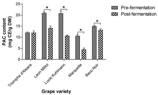 The PAC contents in grape mash from five common grape varieties (Triomphe d’Alsace, Leon Millot, Lucie Kuhlmann, Marquette, and Baco Noir) were quantified before and after fermentation for wine production (Figure 8). Initial PAC content (before fermentation) was high in the Leon Millot (20.9 mg CE/g dry weight [DW]) and Lucie Kuhlmann (20.7 mg CE/g DW) grape varieties compared to the other three grape varieties; Triomphe d’Alsace, Marquette, and Baco Noir. All the tested grape varieties, except for the Triomphe d’Alsace, showed a significant reduction in PAC content after the fermentation process. The Lucie Kuhlmann grape variety depicted the highest reduction in PAC content after the fermentation (20.7 to 10.6 mg CE/g DW). The PAC contents of the Leon Millet (20.9 to 14.1 mg CE/g DW) and Marquette (10.6 to 4.45 mg CE/g DW) grape varieties were also considerably lowered by the fermentation process. The Leon Millet (even after a significant PAC drop) and the Baco Noir grape varieties retained the highest quantities of PAC after the fermentation process (14.1 and 13.2 mg CE/g DW, respectively). Thus, grape by-products of wine production are a suitable source for PAC extraction, and it is important to consider the grape variety when using grape by-products for PAC extraction.