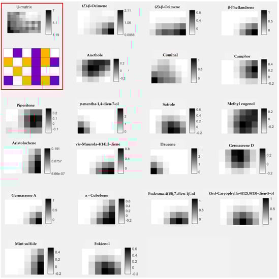 The identification of the most significant molecules is made by observing the region in the U-matrix of active EOs. Once the region was identified, we observed the most expressive molecules in that region. For example, when analyzing the U-matrix, we observe that in the lower right corner, there is a region in purple color, indicating a region of active EOs. Following the analysis, we will observe which molecules are most representative of that region; thus, we have the molecules (E)-β-ocimene, (Z)-β-ocimene and β-phellandrene. Note, in Figure 3, that the individual matrices of these molecules indicate their greater presence in the lower right region, the region of active EOs.