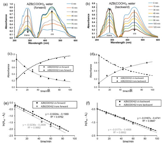 AZB(COOH)2 (10 ppm in water) plots of trans–cis (forward) isomerisation (a,c,d) and cis–trans (backward) isomerisation (b,d,f). (a,b) UV–Vis absorbance vs. wavelength, (c,d) absorbance (A) vs. time, (e,f) ln(Ainf - At) vs. time.