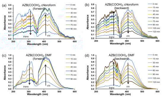 UV–Vis absorbance vs. wavelength AZB(COOH)2 plots of trans–cis (forward) isomerisation (a,c) and cis–trans (backward) isomerisation (b,d) in the indicated solvents with concentrations of 15 ppm in chloroform and 20 ppm in DMF.