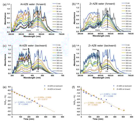 Plot for absorbance vs. wavelength for the forward (trans–cis) isomerisation of (50 ppm) (a) Al-AZB and (b) Zr-AZB. Plot of absorbance vs. wavelength for the backward (cis–trans) isomerisation (c) Al-AZB and (d) Zr-AZB. Plot of ln(Ainf - At) vs. time for (e) Al-AZB and (f) Zr-AZB in water.