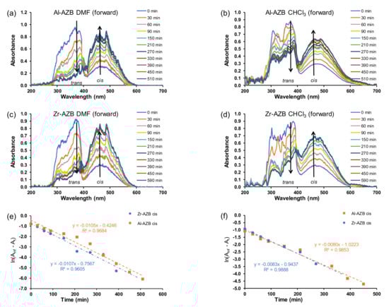 Plot of absorbance vs. wavelength for the forward (trans–cis) isomerisation in DMF (50 ppm) for (a) Al-AZB and (c) Zr-AZB. Plot of absorbance vs. wavelength in CHCl3 (50 ppm) for (b) Al-AZB and (d) Zr-AZB. Plot of ln(Ainf - At) vs. time for Al-AZB and Zr-AZB in (e) DMF and (f) CHCl3.