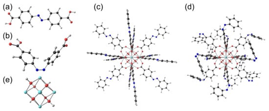 For further insight into the structure and observed UV–Vis spectra of the AZB(COOH)2 ligand and the MOFs, we optimised both the trans and cis AZB(COOH)2 ligand molecules, as well as a small model molecule with the same coordination configuration as Zr-AZB, model-Zr-AZB. The optimised molecules are shown in Figure 5. Zr-AZB MOFs consist of central Zr6H4O8 units (Figure 5c), with each unit connected to 12 AZB(COO)2 linkers. Each Zr of the central Zr6H4O8 unit is 8-coordinated and connected to four bridged O between the Zr atoms in the central unit and to one O of four different AZB(COO)2 linkers. Each experimental Zr-AZB MOF crystal consists of many of these units connected to each other through the linkers. Because of the inhered structure of the Zr-AZB MOF, the surface of Zr-AZB will necessarily contain singly bound ligands that can be in the trans or cis conformation. Model-Zr-AZB consists only of one central Zr6H4O8 unit with 12 AZB(COO)2 linkers with the terminal COOH groups in the singly bound ligands replaced by H for simplification. The DFT optimised structures of trans model-Zr-AZB and cis model-Zr-AZB, with the singly bound linkers on the surface optimised in the trans and cis conformations, respectively, are shown in Figure 5c,d. Note that the surface of the experimental Zr-AZB MOF contains a mixture of singly bound trans and cis ligands.