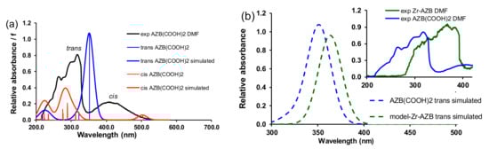 B3LYP gas phase TDDFT calculated oscillators and Gaussian broadening curves (30 nm halfwidth) of (a) trans (blue curve) and cis (red curve) AZB(COOH)2 with the experimental spectrum in DMF shown in black, (b) trans (blue curve) AZB(COOH)2 and trans model-Zr-AZB (green curve) with the corresponding experimental spectra in DMF shown in the inset in blue (trans peak of AZB(COOH)2) and green (trans peak of Zr-AZB).