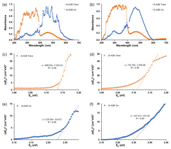 The UV–Vis spectra in water of trans and cis forms of (a) Al-AZB and (b) Zr-AZB as well as Tauc plots of (c) Al-AZB trans isomer, (d) Zr-AZB trans, (e) Al-AZB cis, and (f) Zr-AZB cis.