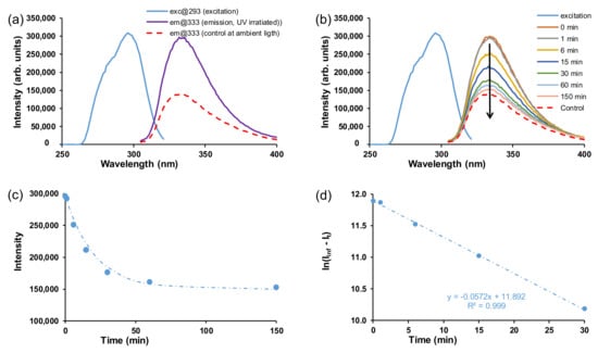 (a) Fluorescence spectra of the 10 ppm AZB(COOH)2 ligand. The excitation curves for both trans and cis overlapped at 293 nm and their emission curves are shown at 333 nm. (b) UV-irradiation followed by excitation and decay of the excitation curve under ambient light. (c) Intensity (I) vs. time and (d) ln(Iinf − It) vs. time.