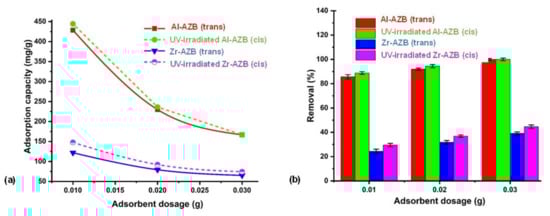 In our previous study, the Zr-AZB and Al-AZB MOFs in their trans conformation were comprehensively tested for Congo Red (CR) dye adsorption [7]. Herein, a preliminary study on the effect of the different conformations (cis versus trans) on dye adsorption is presented in order to observe whether dye adsorption can be enhanced by photo-responsive MOFs. To obtain the cis samples, the MOFs were irradiated (at 365 nm) for 10 h, after which the absorption tests were performed in the dark. The comparable CR dye removal by Al-AZB and Zr-AZB in the trans and the cis conformation is reported in Figure 9. As previously reported, the more than 50% higher and more efficient adsorption of CR by Al-AZB compared to Zr-AZB is attributed to the much higher surface area (2718 m2/g and 1098 m2/g respectively), pore volume (0.86 and 0.35 cm3/g), and pore size (28, 30, 15 Å and 9, 16, 18 Å.) of the aluminium derivative [7]. When comparing the dye adsorption of the cis and trans conformations, it is evident that the UV-irradiated MOFs (cis conformation) gave a slightly higher percentage of CR removal (ca 2–6%) at various adsorbent doses (Figure 9a) compared to the non-irradiated MOFs (trans conformation). UV-irradiation, enabling the isomerization of both Al-AZB and Zr-AZB to the cis-conformations, is thus slightly more favourable for the efficient interaction with CR dye in solution than dye absorption under ambient light. This difference in adsorption between the cis and trans conformation of the MOFs is linked to the polarity of the azobenzene ligand. In the trans conformation, the ligand has a dipole moment of 0 D, whereas the cis has a dipole moment of 3.2 D [10,11]. The increased polarity of the framework enhances the interaction between the dye molecules and the frameworks, ultimately enhancing the dye uptake. Since the partial solvation of the singly bound AZB ligands occurs mainly at the external surface of the suspended MOF crystals, the enhancement effect is small but rather significant. It holds potential for the use of photo-responsive MOFs in advanced materials design.