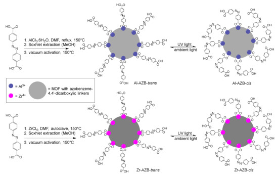 Azobenzene-4,4′-dicarboxylic acid is used as an MOF linker, e.g., in azobenzene-containing zirconium MOFs demonstrated to be effective heterogeneous catalysts for the direct amidation of benzoic acids [3]. Terbium and dysprosium MOFs with azobenzene-4,4′-dicarboxylic acid as linkers display intense photoluminescence properties in the solid-state [4]. The dynamic trans–cis photo-switching in zinc-based MOFs containing azobenzene-4,4′-dicarboxylate linkers lead to dynamic light-induced structural flexibility, which facilitates carbon dioxide capture and release [5]. The trans–cis azobenzene-photo-isomerisation ability also changes the pore environment in a Cu MOF (containing both homochiral D-camphoric acid and light-responsive azobenzene moieties), leading to the enantioselective adsorption of chiral molecules [6]. In all these applications, the rate of the trans–cis isomerization is of importance; thus, this study reports the trans–cis isomerisation kinetics of azobenzene-4,4′-dicarboxylic acid and azobenzene dicarboxylate MOFs with Al3+ and Zr4+ metal centres. The synthesis scheme as described in our previous work is shown in Scheme 1 [7]. Graphene, functionalised with azobenzene side groups on the surface shows similar photo-responsive behaviour as reported in this study [8,9]. Surface-mounted Cu MOFs (SURMOFs) with pillar linkers containing azobenzene side groups between the Cu atoms also show photo-switching, without reporting the kinetics thereof [6,10,11]. A theoretical study on Zr-AZB MOF-containing azobenzene linkers and singly bound azobenzenes on the surface focused only on the adsorption of gases [12]. The MOFs of this study contain azobenzene linkers and singly bound azobenzenes on the surface [7].