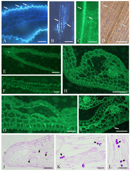 Starch grains are often observed in the cells of secretory tissues. We demonstrated their presence in parenchyma cells located around vascular bundles after the PAS reaction (Figure 2J–L).