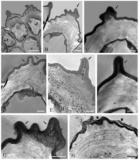 Ultrastructure of epidermis cells in the central part of C. cyanus ray florets (transmission electron microscopy-TEM): (A) epidermis cells and subepidermal parenchyma cell fragments in cross section; the epidermis cells have a very thick outer cell wall, large vacuoles, and parietally located cytoplasm; (B–F) fragments of epidermis cells with a very thick outer wall and cuticular crests in its apical part (arrows); (D,E,H) layered arrangement of structural elements in the cell wall; (E) an osmophilic, flocculent substance, possibly the released secretion, visible in the wall (double arrows); (B,C,F,G) dark substance/secretion accumulated in the wall under the cuticle in the crest area; (H) a dark layer of secretion residues visible on the cuticle surface (arrowheads). Scale bars: 5 μm (A), 2 μm (B), 1 μm (C–H).