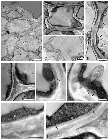 Ultrastructure of parenchyma cells in C. cyanus ray florets (TEM): (A) under the epidermis (e)-parenchyma cells (p) with different-shaped large vacuoles (v), parietal cytoplasm and large intercellular spaces (asterisks) with a dark substance; (B) a cell with walls with varying thickness containing multivesicular bodies in the vacuole and parietally located cytoplasm. The intercellular spaces (asterisks) are filled with a dark substance/secretion; (C) large intercellular spaces filled with a dark substance/secretion along the entire length of some walls (asterisks); (D) fragments of cells with numerous different-sized vesicles (arrows) and mitochondria (m) in the cytoplasm and secretion in the intercellular spaces (asterisks); (E) fragments of cells with dense cytoplasm and a heterogeneous substance/secretion in the intercellular space (asterisk); (F) a plastid (p) with dark stroma, tubular internal structure, and small vesicles in the periplasmic space (arrow); (G) multivesicular body (mb) directed towards the vacuole, plastid (p) with dark stroma and small vesicles in the periplasmic space (arrows); (H) dictyosome (ds) in the dense cytoplasm; (I) smooth endoplasmic reticulum (er) profile and numerous small vesicles located close to the plasmalemma (arrows) and fibrillar material in the intercellular space (asterisk). Scale bars: 5 μm (A), 2 μm (B–D), 1 μm (E), 0.5 μm (F–I).