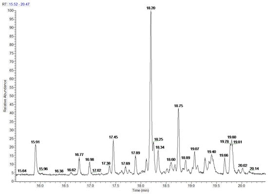Qualitative analysis was carried out by comparison of the MS spectra with the NIST spectral library (National Institute of Standards and Technology, Gaithersburg, MD, USA) [70] and the spectral library of the UMCS Analytical Laboratory (Lublin, Poland). Identity of the volatile compounds was confirmed by their retention indices, which were determined in relation to a homologous series of n-alkanes (C7–C18). The quantitative composition of volatile compounds was determined assuming that the sum of individual compounds is 100%.
