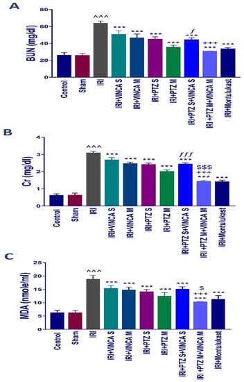 Effects of the different therapies on serum BUN (A), Scr (B), and MDA (C) levels. Bars represent mean ± SD. After the one-way analysis of variance (ANOVA) test, the Bonferroni post hoc test was used to determine the significant differences between the groups, where ^^^: p < 0.001, compared to the control rats. ***: p < 0.001, compared to the IRI group. +++: p < 0.001, compared to the IRI + VINCA M group. ƒ: p < 0.05 and ƒƒƒ: p < 0.001, compared to the IRI + VINCA S group. $: p < 0.05 and $$$: p < 0.001 compared to the IRI + PTZ M group.
