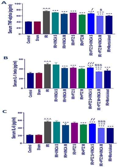 In addition, VINCA M + PTZ M treatment significantly (p < 0.001) reduced serum TNF-α, IL-1β, and IL-6 levels compared to the VINCA M treatment. Finally, treating the IRI rats with VINCA M and PTZ M significantly (p < 0.05, p < 0.001, and p < 0.001) suppressed serum TNF-α, IL-1β, and IL-6 levels, respectively, compared to the PTZ M treatment.