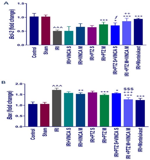 Bcl-2 (A) and Bax (B) molecular expressions in the kidneys of the studied groups using quantitative real-time polymerase chain reaction (qRT-PCR). Data were presented as fold changes relative to the control group. Bars represent mean ± SD. After the one-way ANOVA test, the Bonferroni post hoc test was used to determine the significant differences between the groups, where ^^^: p < 0.001, compared to the control animals. *: p < 0.05, **: p < 0.01, and ***: p < 0.001, compared to the IRI group. $$$: p < 0.001, compared to the IRI + PTZ M group. ƒ: p < 0.05 compared to the IRI + VINCA S group. ++: p < 0.01 and +++: p < 0.001, compared to the IRI + VINCA M group.