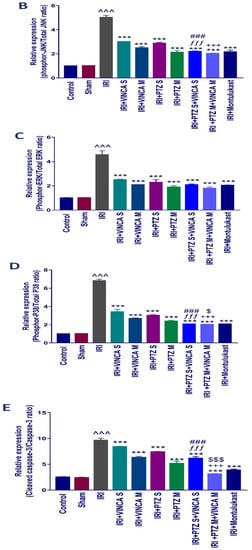 Western blotting was used to determine the effect of vincamine and/or pantoprazole on the measured proteins after using montelukast as control and normalizing the intensities of the bands to β-actin. All the measured proteins were up-regulated in the IRI group relative to the control animals (p < 0.001). Up-regulation of phosphor-JNK1/2/total JNK1/2, phosphor-ERK1/2/total ERK1/2, phosphor-P38/total P38, cleaved caspase-3/caspase-3, and the total NF-kB proteins was observed in the injured rats compared to the normal rats.