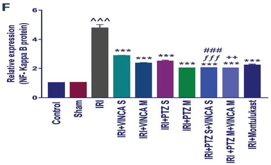 By comparing the IRI rats to the normal rats, there was an obvious (p < 0.001) rise in the serum level of malondialdehyde (MDA), which is a lipid peroxidation by-product and an oxidative stress marker. In comparison to the IRI rats, VINCA S, VINCA M, PTZ S, PTZ M, VINCA S + PTZ S, and VINCA M + PTZ M treatments obviously (p < 0.001) reduced blood MDA levels. Moreover, treating the IRI rats with VINCA M + PTZ M resulted in a significant (p < 0.05 and p < 0.001) reduction in blood MDA levels when compared to PTZ M or VINCA M, respectively (Figure 1C). In these experiments, Montelukast was applied as a control therapy, which consistently exhibited protective benefits (Figure 1A–C) as previously described [34].