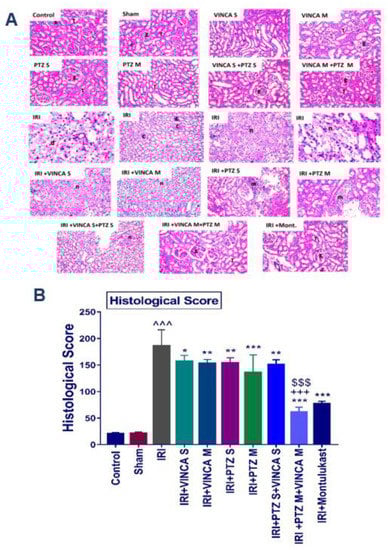 The following are available online, Figure S1. Effects of the different therapies on serum BUN (A), Scr (B), and MDA (C) levels; Figure S2. Impact on the inflammatory cytokines levels. Serum levels of (A) TNF-α, (B) IL-1β, and (C) IL-6 (pg/ml) for the studied groups; Figure S3. Bcl-2 (A) and Bax (B) molecular expressions in the kidneys of the studied groups using RT-PCR; Figure S4. Effects on JNK1/2, ERK1/2, p38, caspase-3 and NF-kB proteins expression. (B–F) Expressions of phosphor-JNK1/2/total JNK1/2, phosphor-ERK1/2/total ERK1/2, phosphor-P38/total P38, cleaved caspase3/caspase-3 and total NF-kB proteins, respectively. Figure S5 (B). Histological score regarding the damage of the studied groups: Control, Sham, VINCA S, VINCA M, PTZ S, PTZ M, VINCA S + PTZ S, VINCA M + PTZ M, IRI, (IRI + VINCA S), (IRI + VINCA M), (IRI + PTZ S), (IRI + PTZ M), (IRI + VINCA S + PTZ S), (IRI+VINCA M + PTZ M), (IRI + Montelukast) (IRI + Mont.) groups.