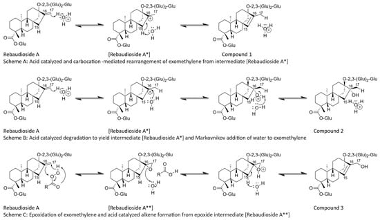 However, stevia sweeteners are not without challenges compared to sugar-based ingredients. Numerous studies have reported the chemical instability of Reb A under various conditions (light, elevated temperature, and low pH); however, characterization of the mechanisms of degradation is lacking [7,8,9]. Understanding the pathways stevia sweeteners degrade upon is of importance, as these ingredients are commonly utilized in low-pH shelf-stable products. More recently, Gelinas et al. [10], using an untargeted chemical profiling approach, identified three Reb A degradation compounds generated during storage that directly resulted in a perceivable flavor change. The three degradation compounds were identified as 13-[(2-O-β-d-glucopyranosyl-3-O-β-d-gluopyranosyl-β-d-glucopyranosyl)oxy]-ent-kaur-15-en-19-oic acid β-d-glucopyranosyl ester (compound 1), 13-[(2-O-β-d-glucopyranosyl-3-O-β-d-glucopyranosyl-β-d-glucopyranosyl)oxy]-16-β-hydroxy-ent-kauran-19-oic acid β-d-glucopyranosyl ester (compound 2), and 13-[(2-O-β-d-glucopyranosyl-3-O-β-d-gluopyranosyl-β-d-glucopyranosyl)oxy]-17-hydroxy-ent-kaur-15-en-19-oic acid β-d-glucopyranosyl ester (compound 3). Others have reported that the degradation of Reb A can reach levels that result in a perceivable loss of sweetness intensity [8].