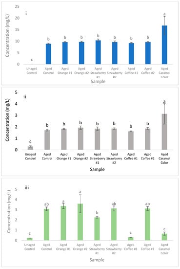 Quantification of rebaudioside A degradation compounds 1 (i), 2 (ii), and 3 (iii) in unaged and aged (6 weeks, 35 °C) acidified aqueous samples consisting of rebaudioside A (control samples) or rebaudioside A with different flavors (two orange, two strawberry, two coffee) and color (caramel). Different letters indicate significant differences at α = 0.05 Tukey HSD.