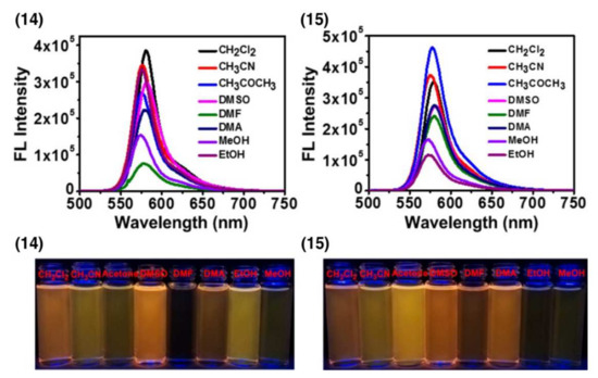 Fluorescence spectra of metallocycles 14 and 15 in different solvents (λex = 556 nm, c = 1.00 μM). Photographs of 14 and 15 under UV lamp at 365 nm in different solvents. Adapted from [14].