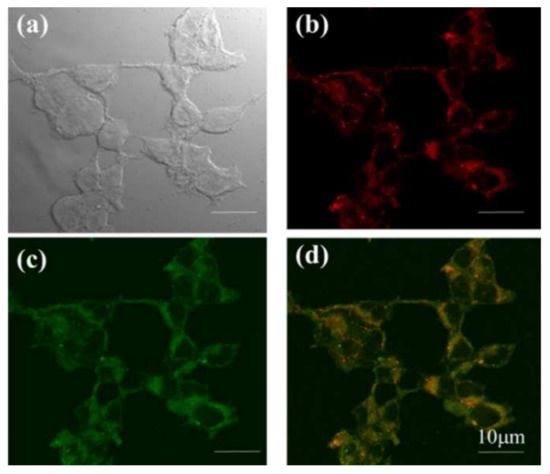Confocal microscopic images of MCF-7 cells after 4 h of incubation with 17: (a) bright field, (b) fluorescence of Mito Tracker Deep Red, (c) fluorescence of 17, and (d) merged image of (b,c). Scale bar = 10 μm. Adapted from [15].
