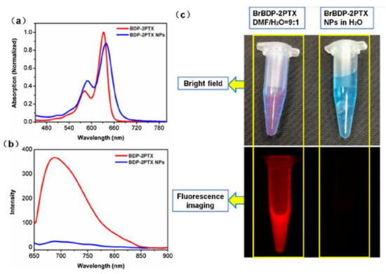The symmetric BrBDP-2PTX 20 can be self-assembled into stable and uniform nanoparticles with a diameter of around 130 nm by the nanoprecipitation method. The maximum absorption of nanoparticles of 20 in DMF/H2O = 9:1 (v:v) at 639 nm was red-shifted by 7 nm relative to 20 (maximum at 632 nm) (Figure 5). This effect is indicative of J-aggregation of 20 in an aqueous solution. Relatively strong red fluorescence was observed for the conjugate (with a maximum at 688 nm), while the fluorescence of nanoparticles of 20 was quenched due to aggregation.