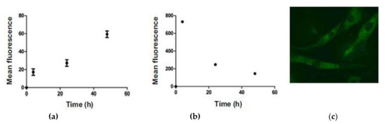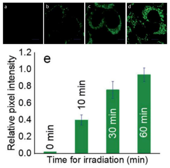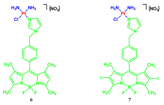 Complexes 6 and 7 demonstrated strong absorption bands in the visible region at 500 nm (ε = 27,000 M−1 cm−1) and 510 nm (19,000 M−1 cm−1), respectively [9]. Fluorescence of complex 6 has a band at 510 nm with a quantum yield of 0.09 in 1% DMSO/DMEM (pH 7.2). Complex 7 containing the diiodo-BODIPY unit is non-emissive.