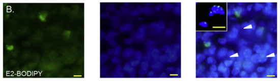 - Okamoto, M.; Kobayashi, S.; Ikeuchi, H.; Yamada, S.; Yamanouchi, K.; Nagasawa, K.; Maekawa, S.; Kato, T.; Shimizu, I. Synthesis and bioassay of a boron-dipyrromethene derivative of estradiol for fluorescence imaging in vivo. Steroids 2012, 77, 845–849. [Google Scholar] [CrossRef]