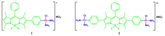 The authors of [6] developed two BODIPY-based monofunctional Pt(II) complexes 1 and 2 for PDT (Scheme 1).