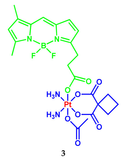 Currently, Pt(II) complexes, informally called simply “platinum”, are used as cytostatic antitumor chemotherapeutic drugs [1,2,3,4,5]. Among them, cisplatin is widely known as a first-generation drug and its analogs—carboplatin and oxoplatin—are of the second and third generation. However, the non-fluorescent nature of platinum-based drugs becomes an obstacle to tracking the processes of translocation, drug release, and excretion of anticancer agents. The introduction of BODIPY-luminophor into antitumor Pt drugs allows cancer therapy under the control of fluorescence imaging. In this section, for convenience, Table 1—with the main parameters for the studied conjugates presented in the cited articles—was added.