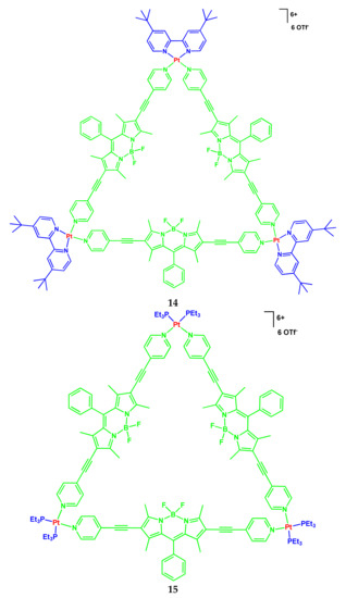 Another example of BODIPY conjugates with platinum compounds was demonstrated in the work [14]. Herein, the authors presented the coordination-driven self-assembly of two highly emissive platinum(II) supramolecular triangles 14 and 15 containing BODIPY-based bridging ligands (Scheme 9).