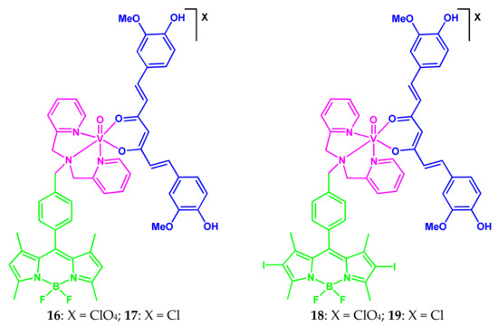 In 2017, three-component vanadium(IV) oxide conjugates 16–19 of curcumin, dipicolylamine containing non-iodinated or iodinated BODIPYs as side photoactive parts (Scheme 10) were presented [15].