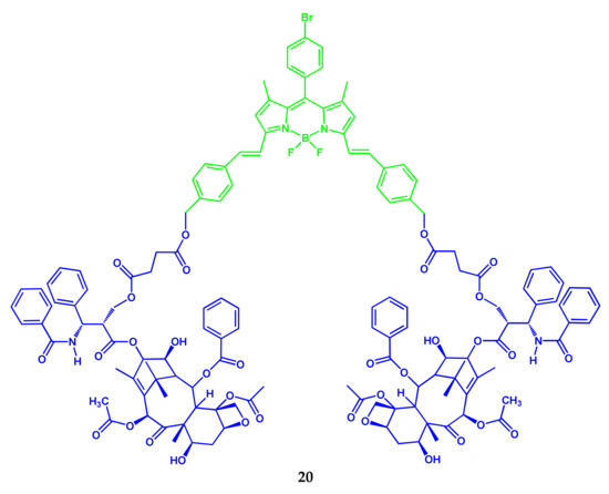 An NIR-brominated BODIPY-paclitaxel conjugate 20 was synthesized by Tao Zhang and colleagues (Scheme 11) [16].